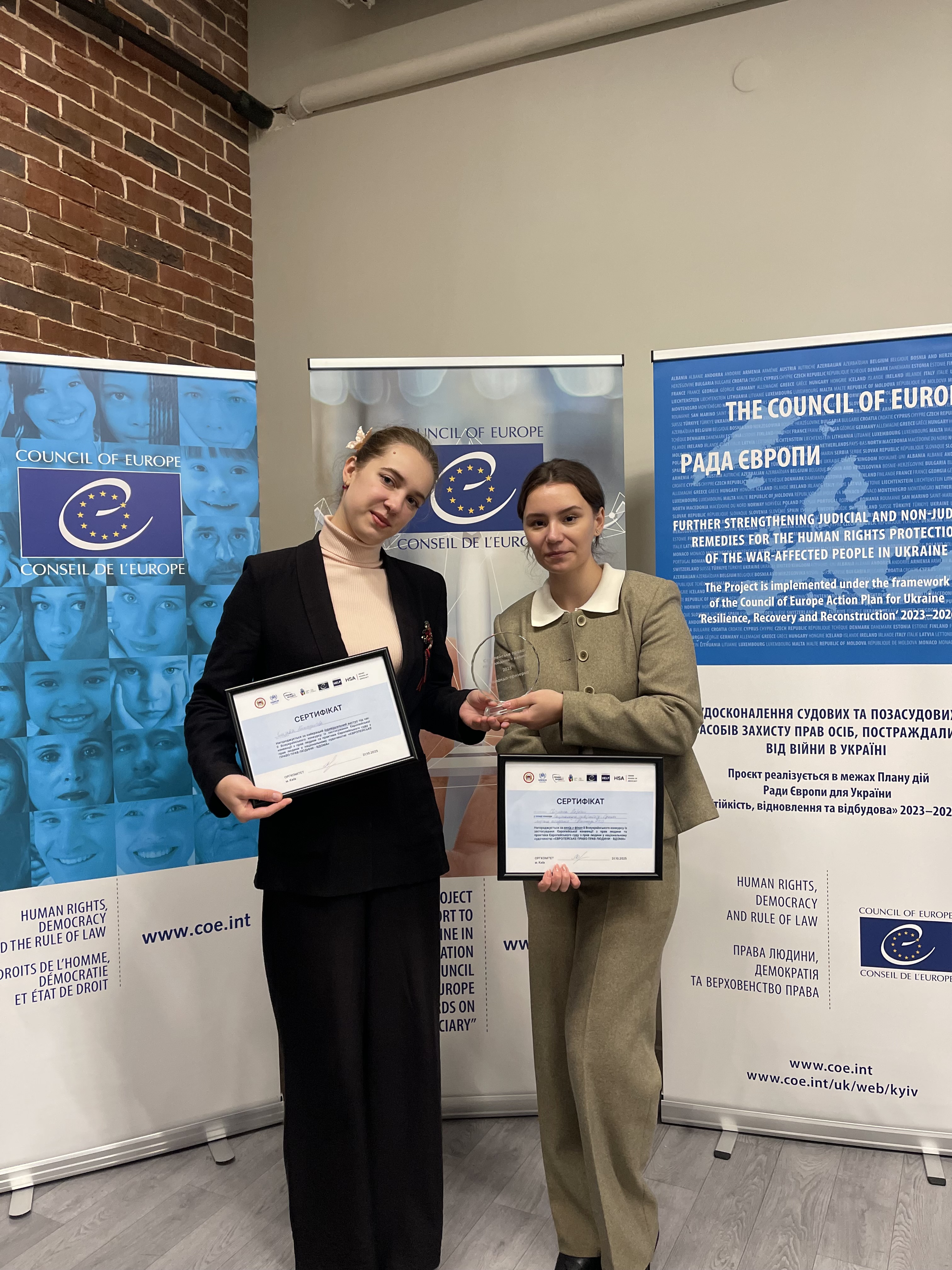 За результатами конкурсу команда магістрів  НУОМА у складі здобувачів вищої освіти другого (магістерського) рівня навчання за спеціальністю Право Світлана Коротиша та Єлизавета Комендантова, з тренерською підтримкою доцентки кафедри загальноправових дисциплін, к.ю.н., доц. Кармазіної Катерини Юріївни, виборола скляну статуетку і дипломи, що підтверджують титул  “Команда-Призер” (2 місце), сувеніри від організаторів та Верховного Суду, запрошення на стажування від Верховного Суду та БО «БФ «Право на захист».  Єлизавета Комендантова була нагороджена титулом “Найкращий оратор”.
