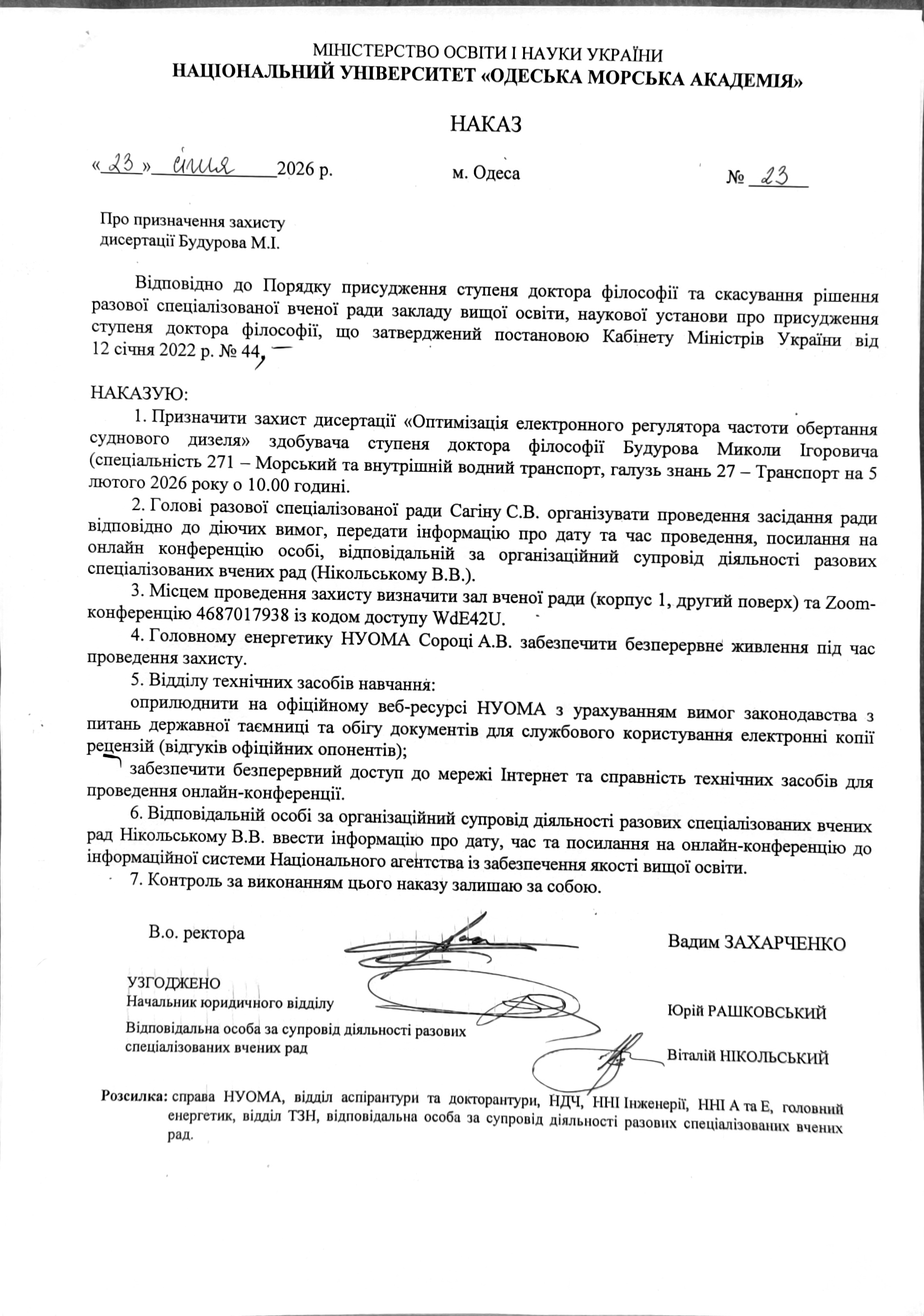 Наказ про утворення разової ради Рішення про присудження наукового ступеня Ідентифікатор онлайн-трансляції – 446 353 8124 (Код доступу: 2023) |
