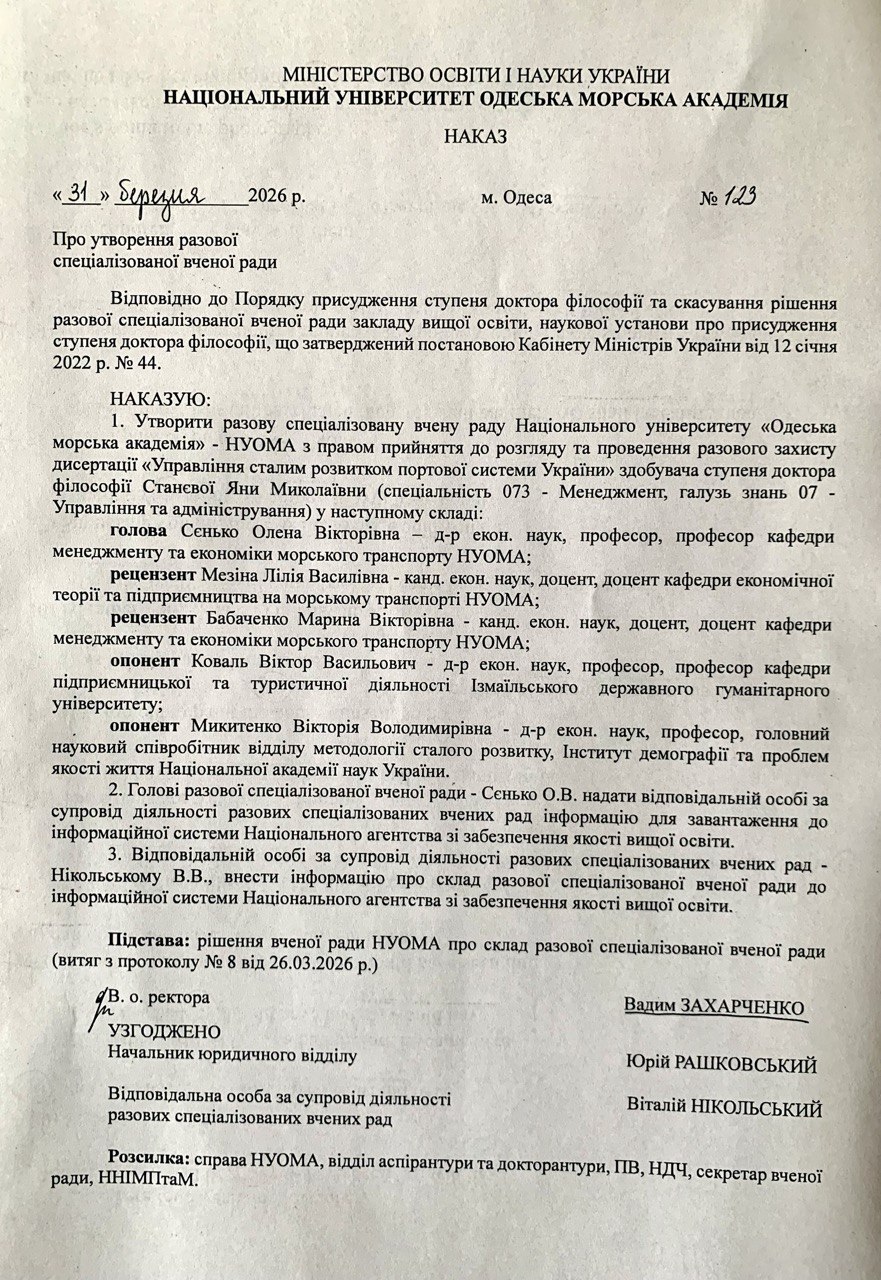 Підтверження накладання електронного підпису Рішення разової спеціалізованої ради Пропозиції щодо утворення разової спеціалізованої вченої ради Наказ про утворення разової ради Посилання на онлайн-трансляцію (Код доступу: 2023) |